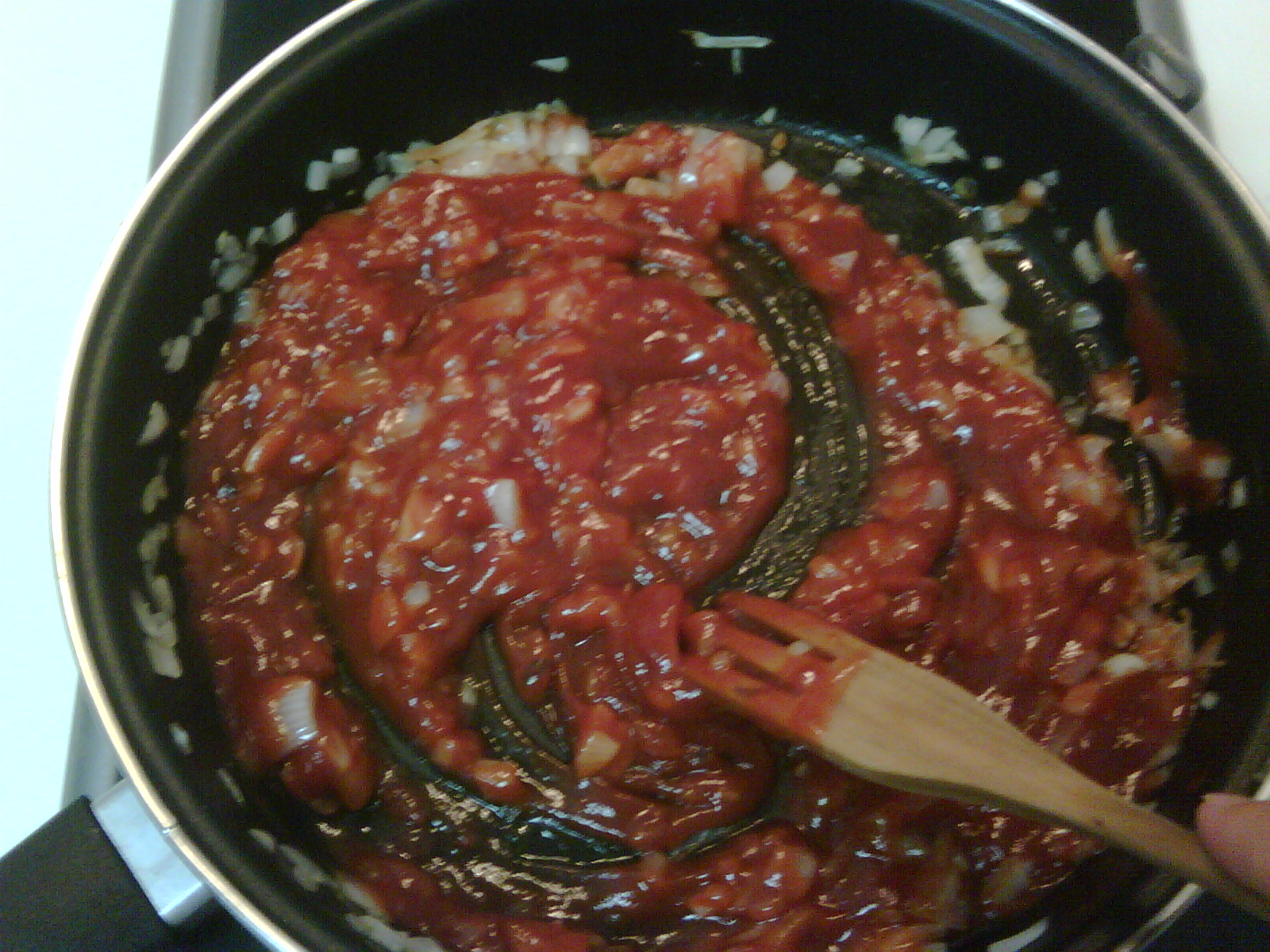 Picamos finito la media cebolla y la freímos con muy poco aceite y a fuego a lento hasta que dore, después bajamos el fuego y añadimos el ketchup, el vinagre y el azúcar removemos hasta que se deshaga el azúcar y apartamos.