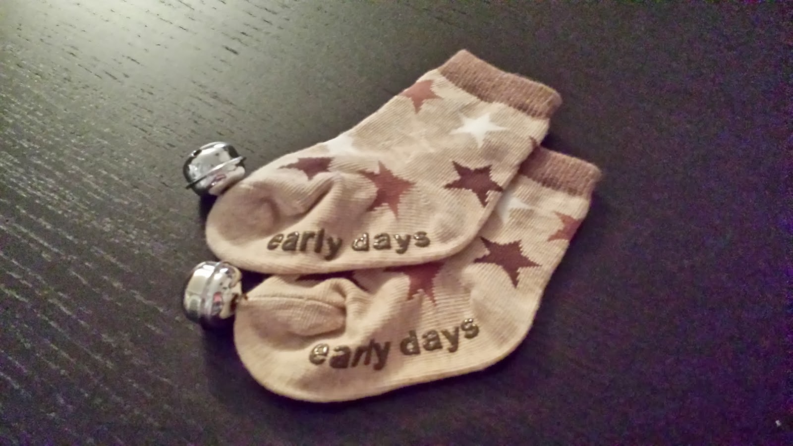 Simplemente use un par de calcetines del paquete que compre en Primark y costo 2€, unos cascabeles que he comprado en un «todo a 100» y han costado 0,49€ y aguja e hilo que tenia por casa. Por un precio que no llega a 2,50€ y 5 minutos de tiempo, tengo un sonajero para pies y aun me sobran 2 cascabeles mas y 3 pares de calcetines.